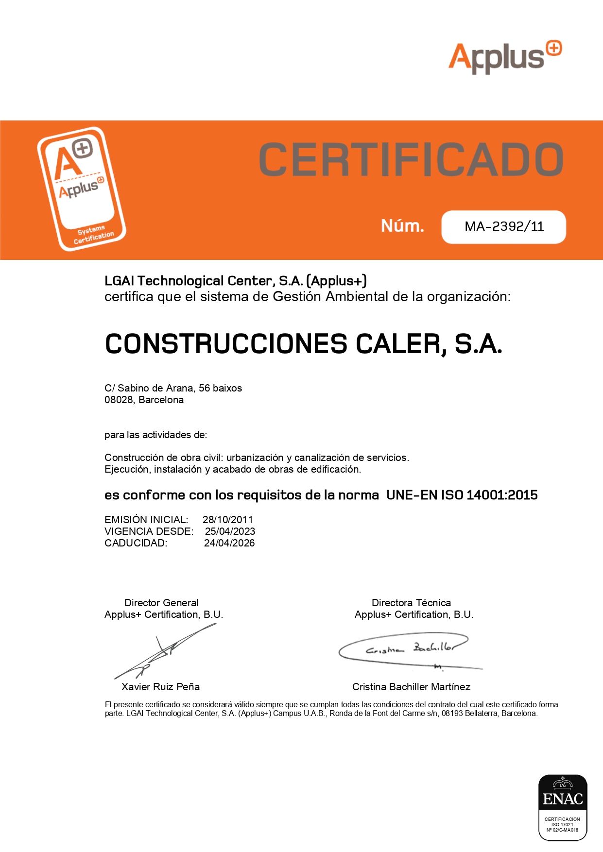 Construcciones Caler tiene implantado un Sistema de Gestión Ambiental certificado por Applus (certificado MA-2392/11), con los siguientes principios y compromisos:
